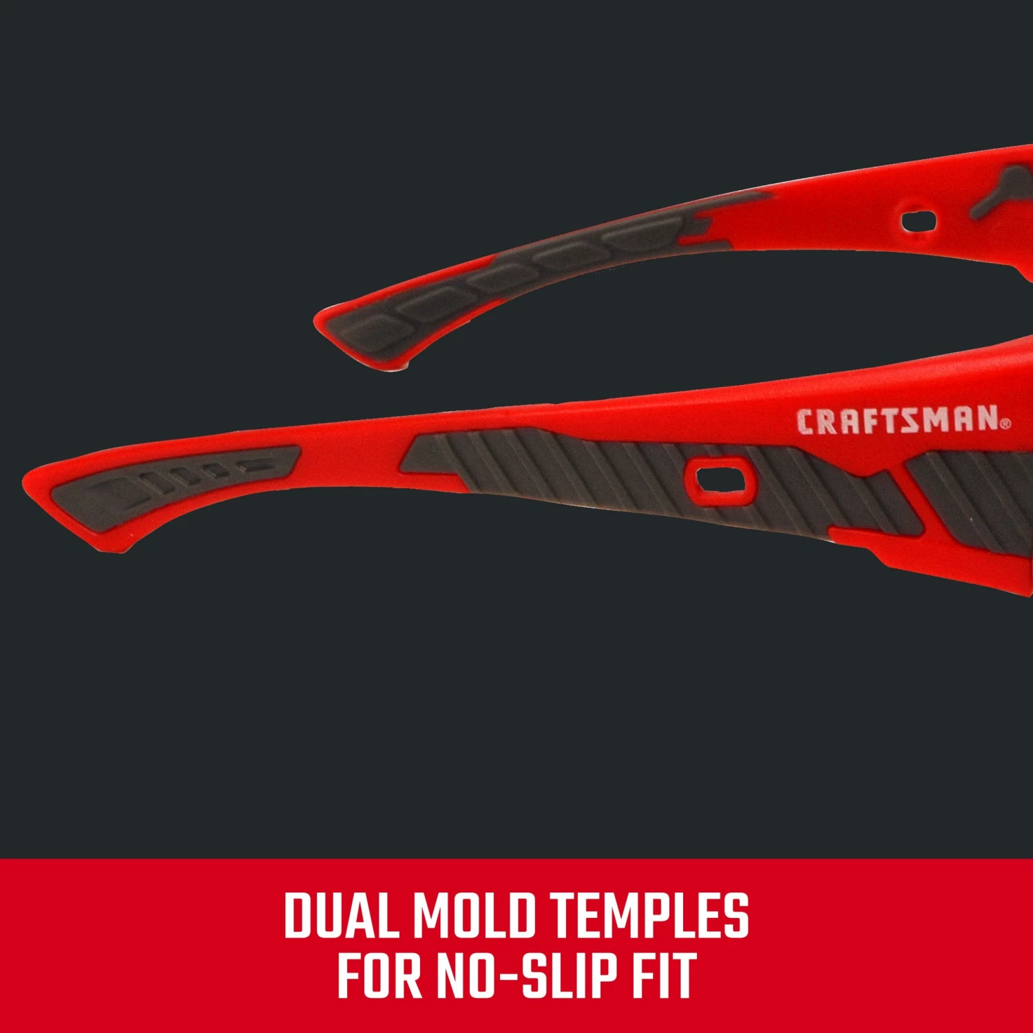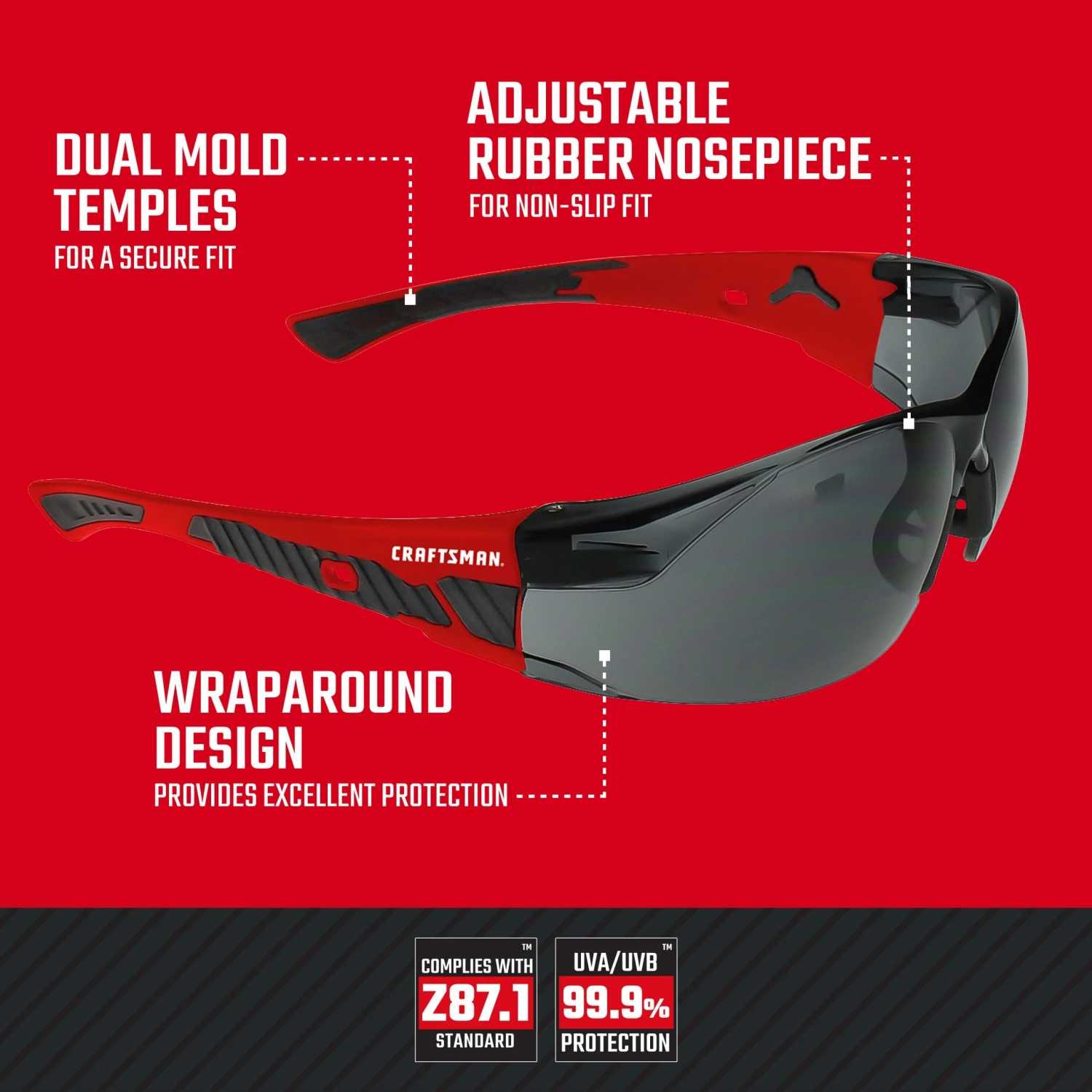 The Craftsman 220 safety glass offers a lightweight frame with stylish molded temples. Adjustable rubber nose piece provides a comfortable, customized no-slip fit. Polycarbonate lens is impact resistant. Meets ANSI Z87.1 standards and provides 99.9% UVA/UVB protection.