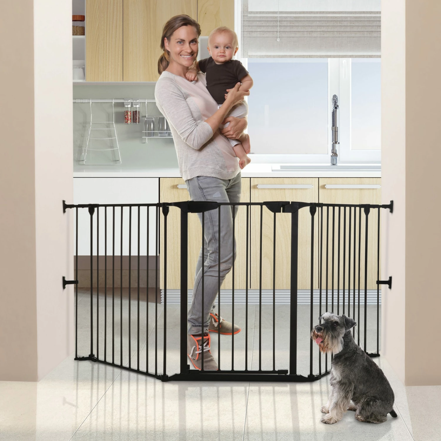 - Panels can be opened to create an extra-long gate, or protective guard around a room or door