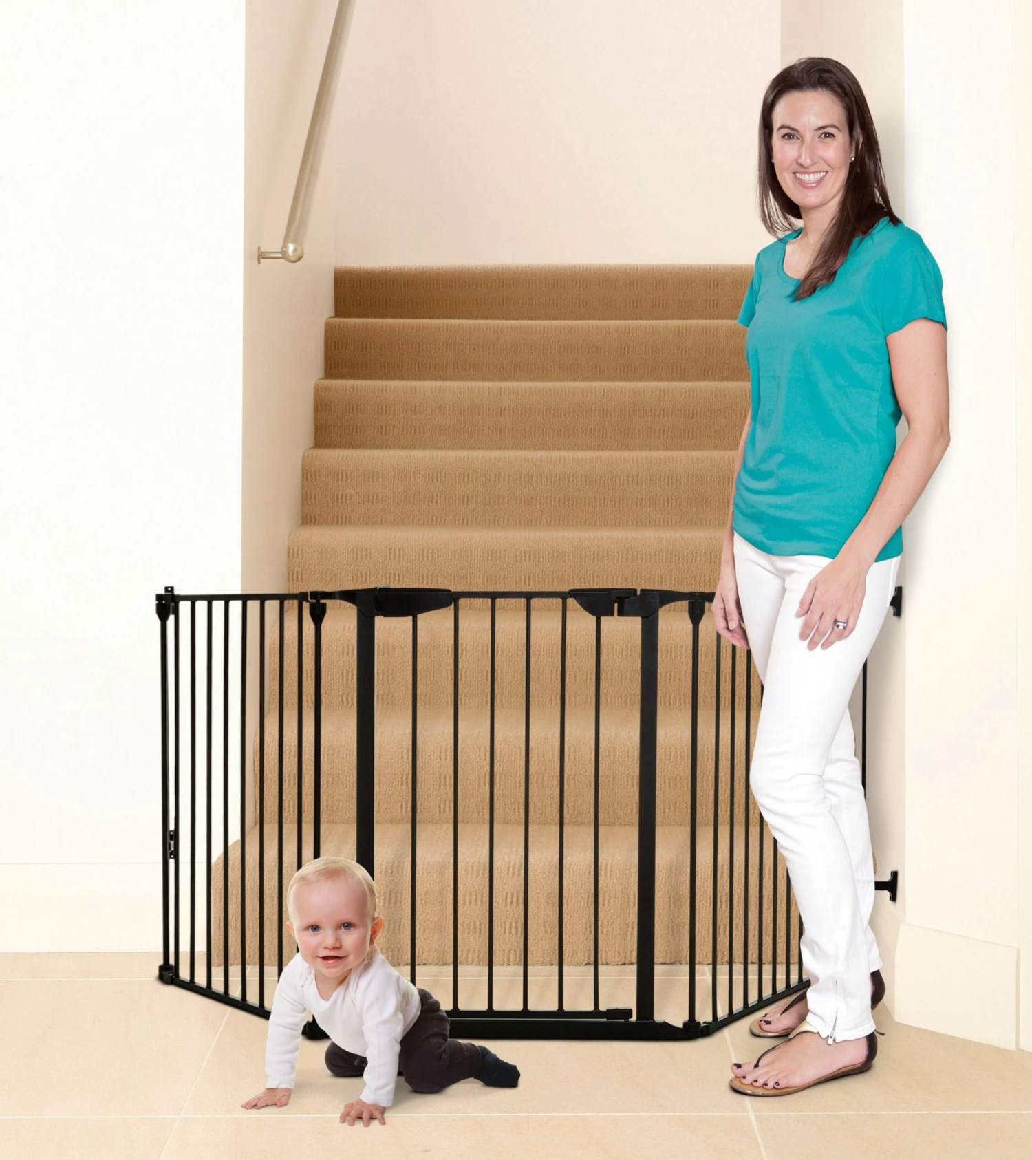 The Newport Adapta gate is a hardware mount gate designed to accommodate straight, angled or irregular shaped openings. It creates a safe and roomy landing space at the top or bottom of staircases.