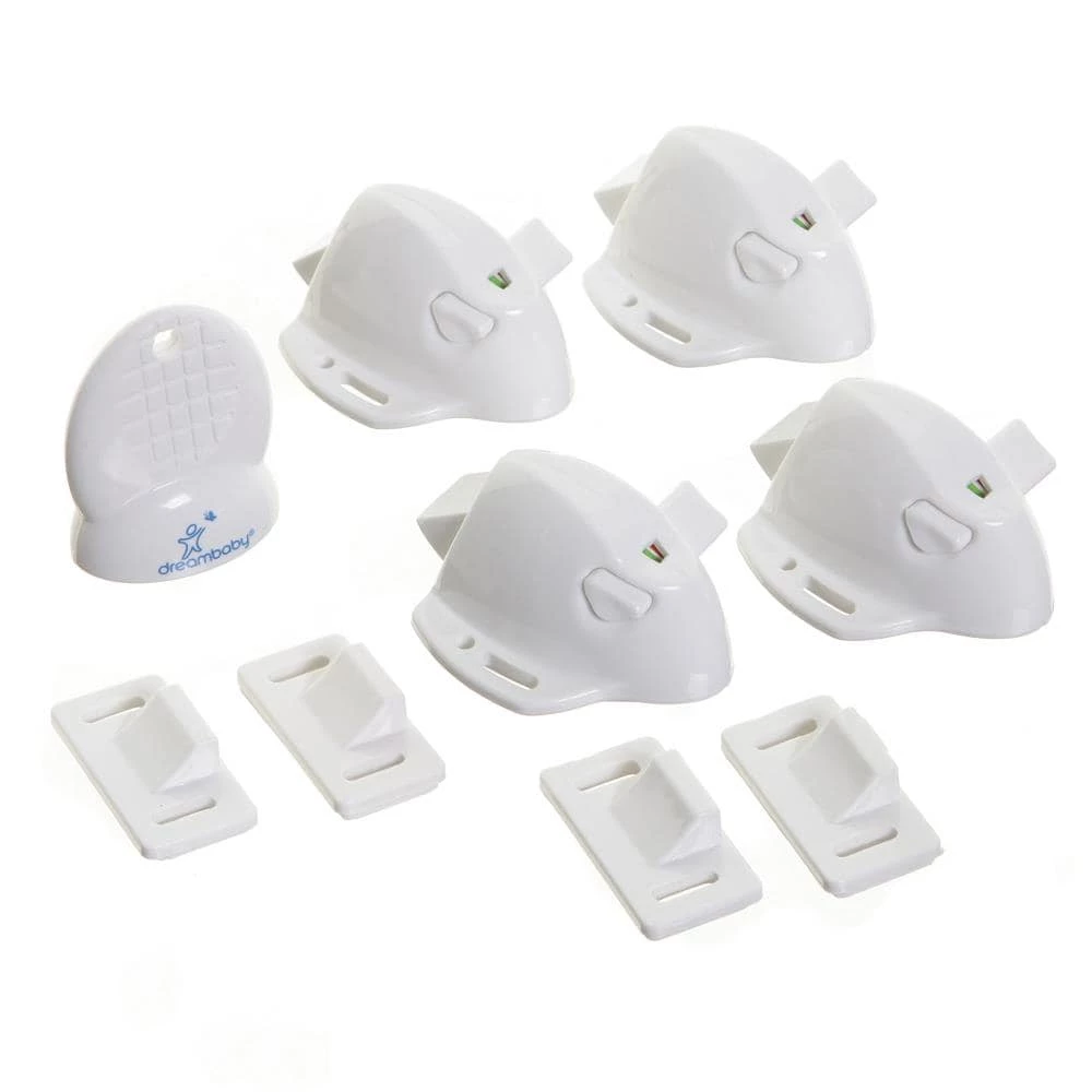 Dreambaby® Adhesive Mag Locks® are sturdy, adhesive locks designed to help keep your children safer and help protect your good dishes, photo albums, and more from curious toddlers. Adhesive Mag Locks are designed with a powerful, magnetic locking system that requires a key to be opened. For even greater convenience, each lock features a disengaging feature and an EZY-Check Red/Green Indicator. This allows you to disengage the lock when it isn’t necessary and easily verify whether the lock is engaged or disengaged.
