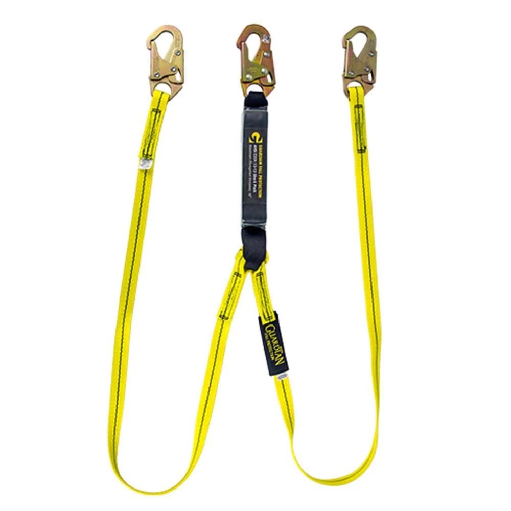 The shock absorbing lanyard is the premiere free fall lanyard offered by Guardian Fall Protection. It meets all the stringent ANSI Z359.13-2013 regulations, and the integrated shock absorbing component limits average arresting forces to 900 pounds or less. It is comprised of 1 inch nylon webbing, and is available in a variety of lengths and connector options, including steel and aluminum snap hooks and rebar hooks, all of which make it one of the most functional and durable lanyards on the market.