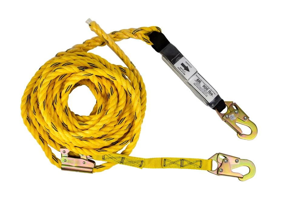 - Complete assembly includes: poly steel rope, shock absorber, positioning device, 18 inch extension lanyard, and two double locking snap hooks