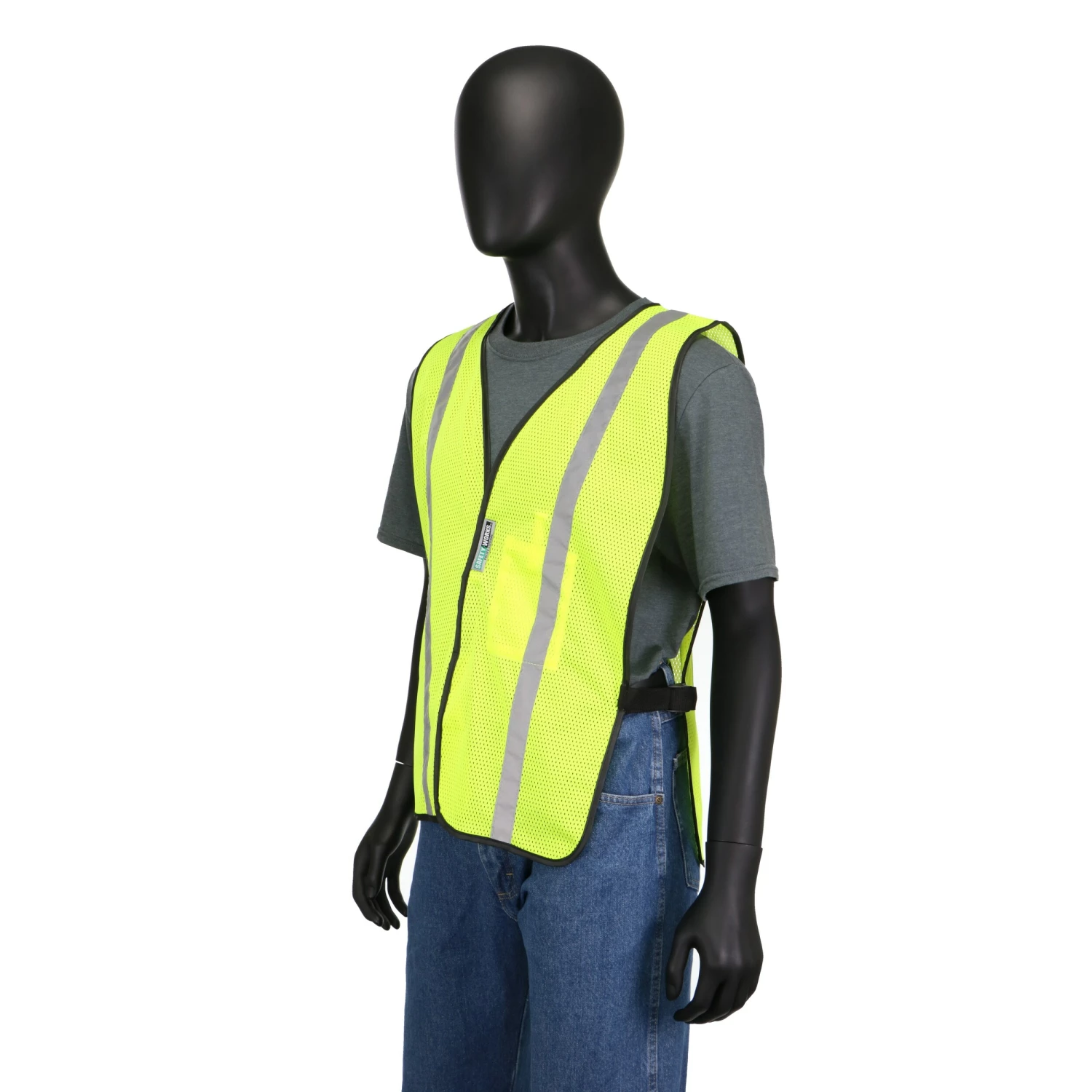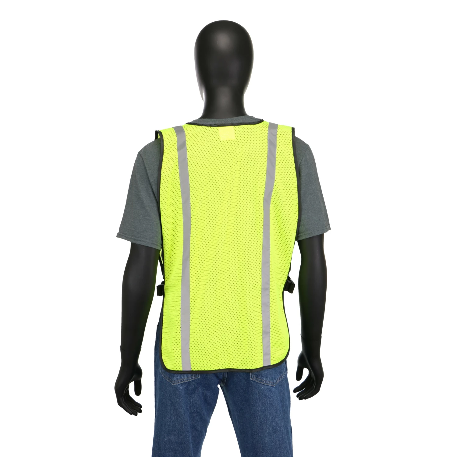High visibility yellow mesh vest with ANSI standard reflective tape to ensure worker is completely visible. Adjustable side straps and hook and loop front closure keeps vest secured around user. Internal pocket allows extra storage.