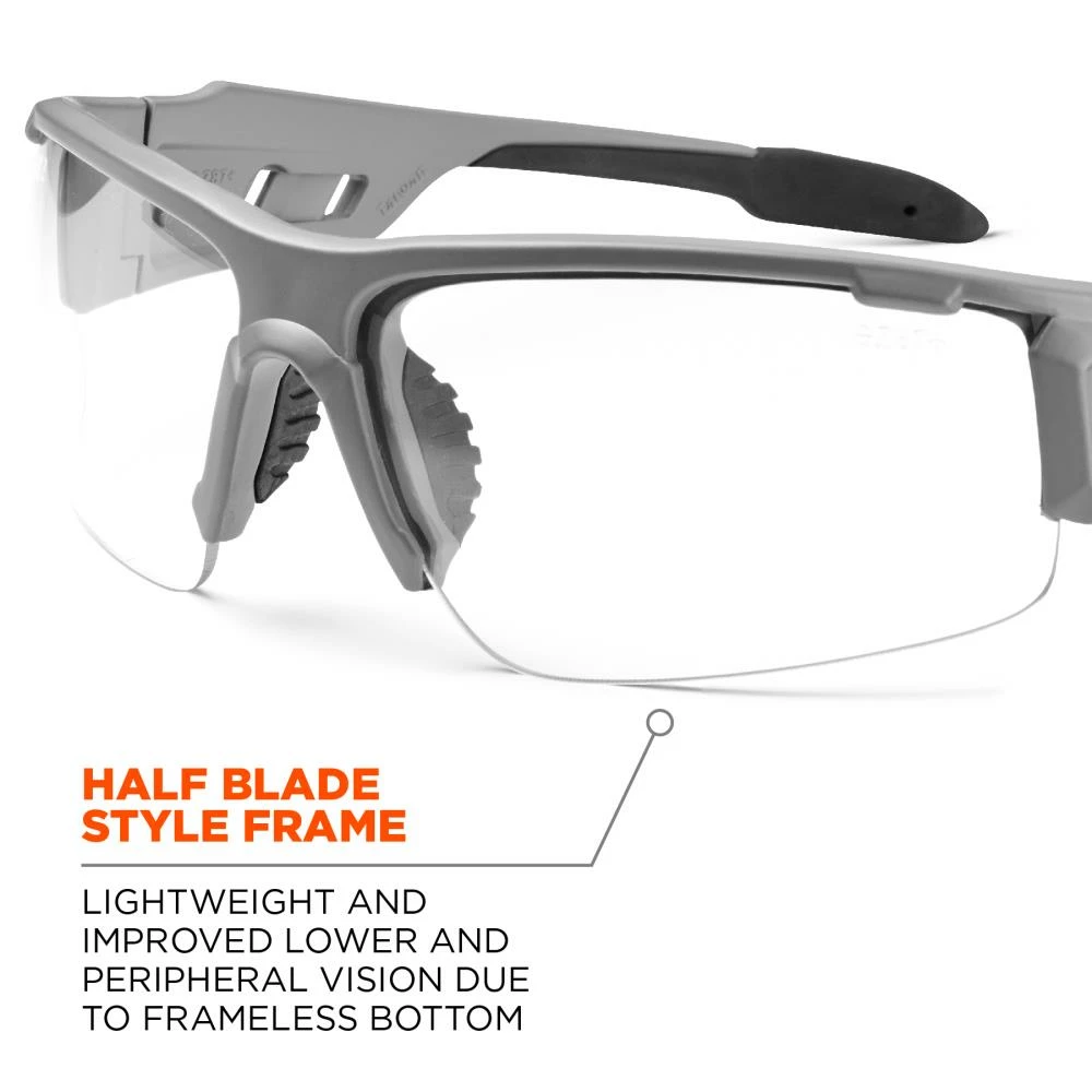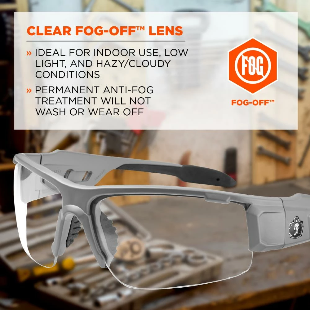 | Package Contents | Ergodyne Skullerz Dagr Safety Glasses/Sunglasses, Matte Gray, Anti-Fog Clear Lens |