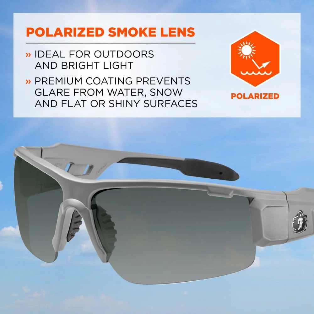 | Package Contents | Ergodyne Skullerz Dagr Safety Glasses/Sunglasses, Matte Gray, Polarized Smoke Lens |