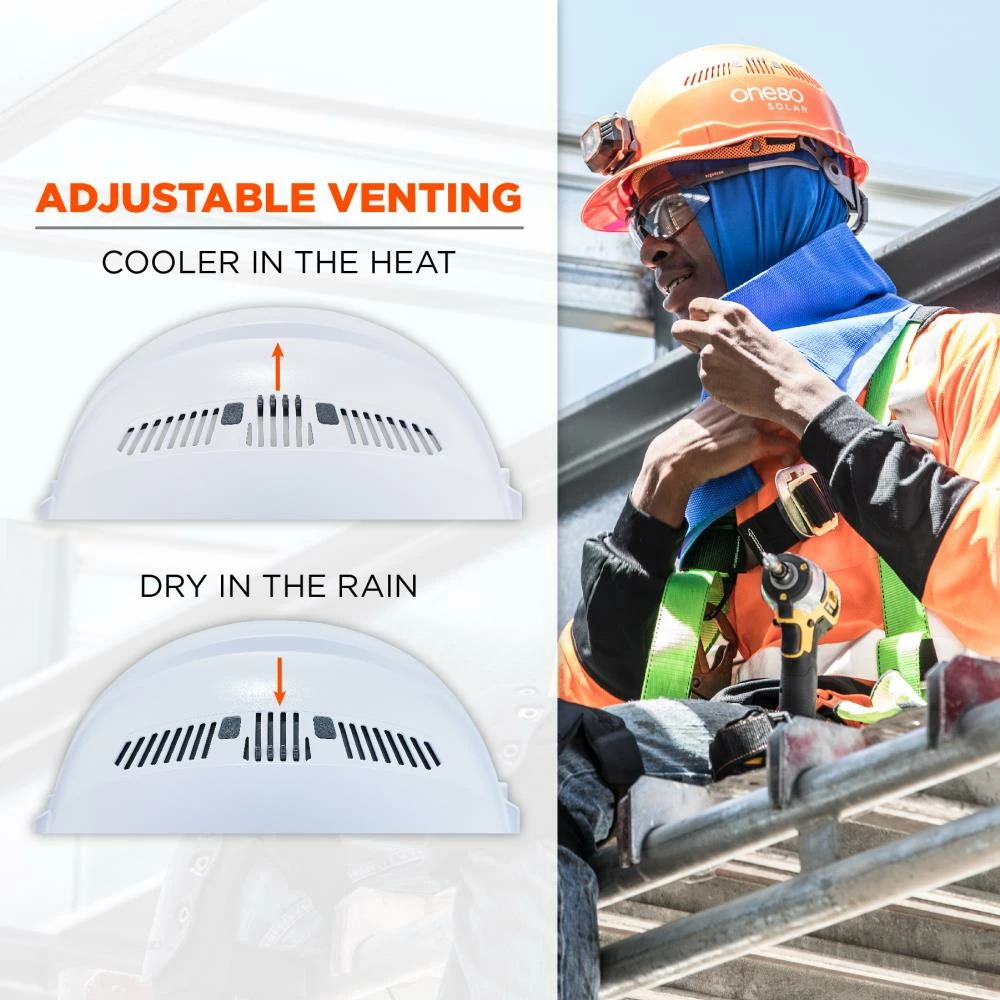 - Breathable – flexible open frame improves air circulation and adjustable venting allows for a cooler hard hat in the heat and a dry hard hat in the rain