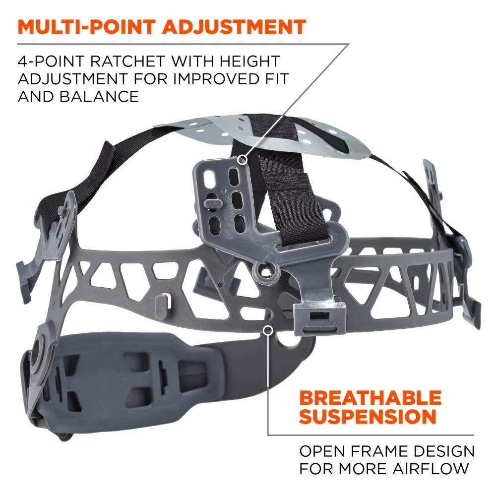 - Hard hat accessories – slotted and mounting locations for common hard hat accessories like ear protection and face shields, chin strap accessory mounts to dedicated mounting points on the suspension, hard hat stickers sold separately