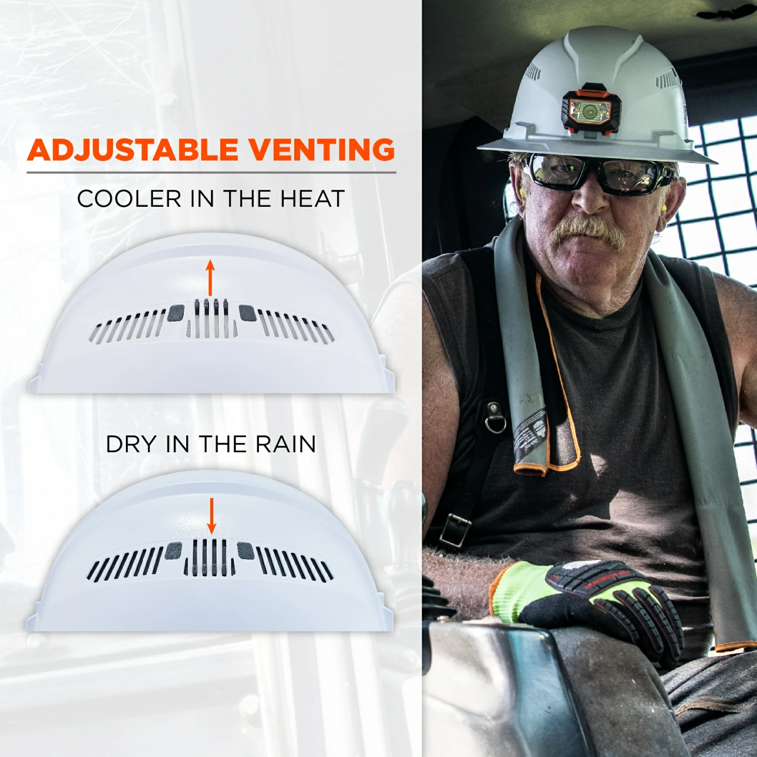 - Breathable – flexible open frame improves air circulation and adjustable venting allows for a cooler hard hat in the heat and a dry hard hat in the rain
