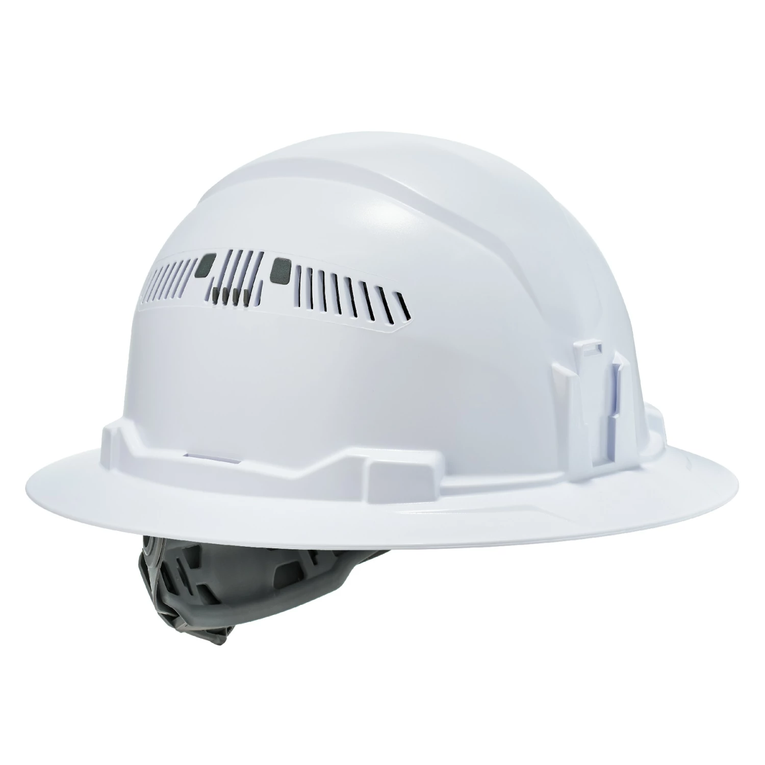 The Skullerz 8973 Class C Full Brim Hard Hat with 4-point suspension is heavy-duty yet lightweight and comfortable head protection built to protect the top of the head from falling objects or bumping into stationary objects. A padded, moisture-wicking and odor-resistant sweatband and top pad lines the sides, forehead and top interior and is removable for easy replacement.This full-brim style helps keeps rain away from the eyes and provides extra protection against falling or flying debris. Also offers all-around protection from the sun, humidity and heat. The open frame design in combination with the adjustable venting offers the best of both worlds: a cooler hard hat in the heat and a dry hard hat in the rain. These vents release heat buildup and allow air to circulate, reducing perspiration in hot and humid working environments.