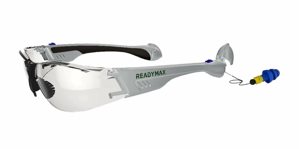 Vision and Hearing Protection in ONE Safety Product. ReadyMax SoundShield Construction Silver Frame Clear Lens Safety Glasses feature our patented safety eyewear and hearing protection combination. Perfect for outdoor use, these glasses feature anti-fog, scratch resistant and polycarbonate impact resistant lenses that absorb 99% of UV rays and ready to use, retractable PermaPlug earplugs that provide NRR 27 noise protection. ReadyMax Construction Safety Glasses provide our most extensive side shield protection and are perfect for even your most heavy-duty jobs. Ideal for construction environments and outdoor activities. ReadyMax SoundShield safety glasses are ANSI Z87.1-2015, CSA Z94.3-07 and CE Compliant. Retractable, Reusable, Recyclable NRR25 PermaPlug earplugs are high quality molded silicone. Nylon Tether extends 4 in. with a 22 lb. test designed to break away if necessary. Tethering reduces FOD and ensures protection is always on hand. Silver Frame, Clear Lens.