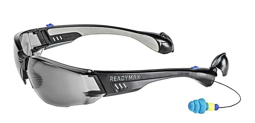 Vision and Hearing Protection in One Safety Product. ReadyMax SoundShield Construction Gray Lens Safety glasses feature our patented safety eyewear and hearing protection combination. Perfect for outdoor use, these glasses feature anti-fog, scratch resistant and polycarbonate impact resistant lenses that absorb 99% of UV rays and ready to use, retractable PermaPlug earplugs that provide NRR 25 noise protection. ReadyMax Construction Safety Glasses provide our most extensive side shield protection and are perfect for even your most heavy-duty jobs. Ideal for construction environments and outdoor activities. ReadyMax SoundShield safety glasses are ANSI Z87.1-2015, CSA Z94.3-07 and CE Compliant. Anti-fog and Scratch Resistant. Absorb 99% of UVA/UBA rays. Retractable, Reusable, Recyclable NRR25 PermaPlug earplugs are high quality molded silicone. Nylon Tether extends 4 in. with a 22 lb. test designed to break away if necessary. Tethering reduces FOD and ensures protection is always on hand. Black Frame, Gray Lens.
