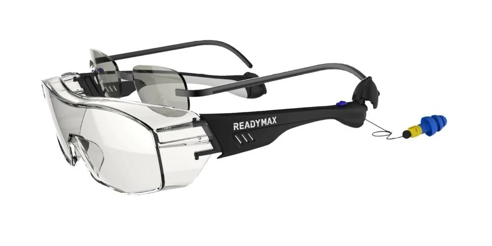ReadyMax SoundShield Fit Over Safety glasses feature a patented safety eyewear and hearing protection combination, and comfortably fit over prescription eyeglasses. SoundShield Fit Over Safety glasses have a lightweight, contemporary design with anti-fog, scratch resistant and impact resistant polycarbonate lenses that absorb 99% of UV rays and offer side shield protection. They also include ready to use, retractable PermaPlug earplugs that provide NRR 25 noise protection. ReadyMax safety glasses are ideal for work environments and outdoor activities including hunting, yard work, and other home projects.