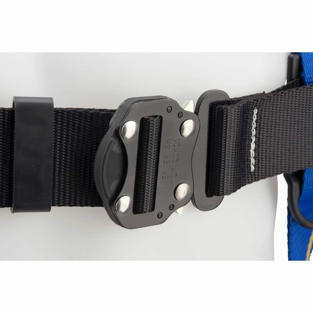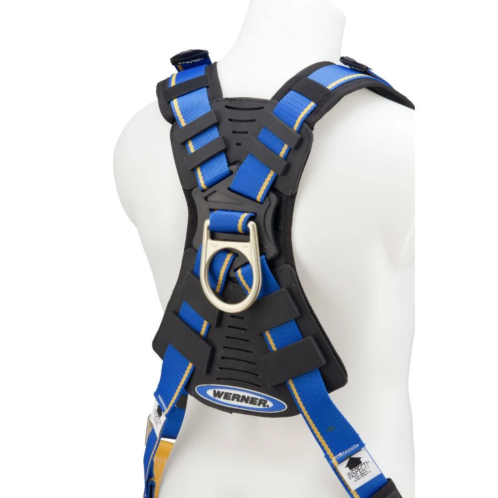 Werner Blue Armor 2000 harnesses are designed and manufactured for the most demanding applications and the most serious professional user. Unique wear indicating webbing and impact indicators allow for easy inspection. They feature 5-point adjustments for optimal fit, lightweight hardware and pads, and bright colors for worker visibility on the jobsite. The back pad is large enough to protect the user, padded to absorb sweat, feels comfortable, and designed to prevent tangling when donning the harness. Shoulder pads provide additional user comfort. The rear dorsal D-ring is made from high quality forged alloy steel for strength and durability. Hip D-rings for positioning applications. Made for general construction, these harnesses are designed for tool carrying capabilities with a removable body belt. Quick connect chest and leg buckles for fast and easy connections.